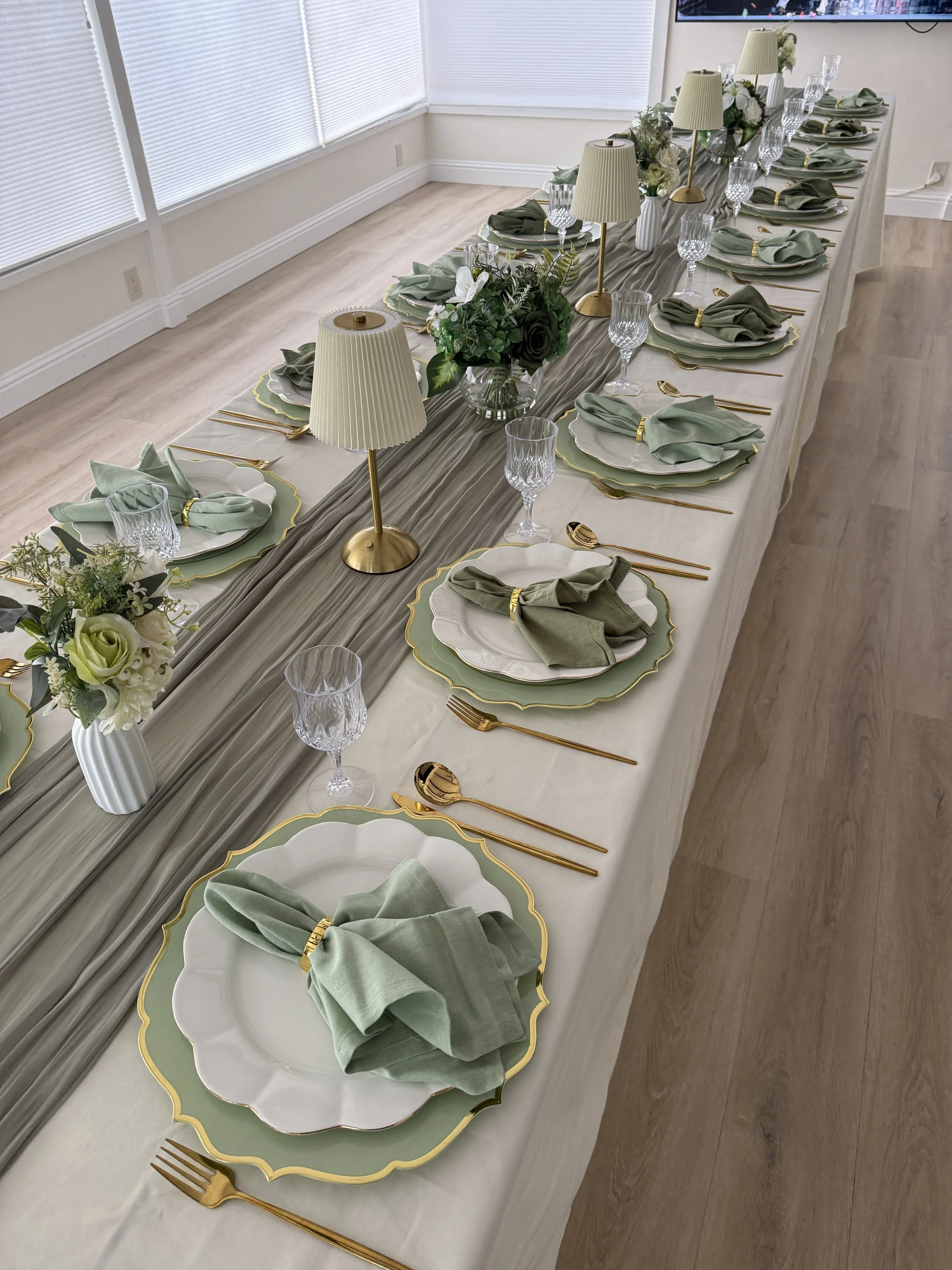 Includes Table linens, table decor (rechargeable lamps, candles, fake flower centerpieces) & complete placesettings for each guest.