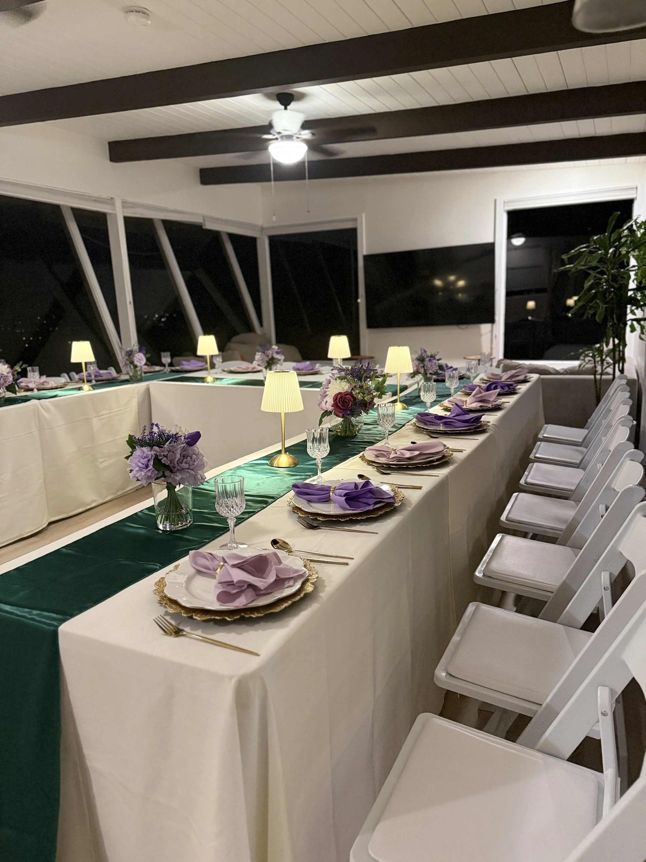 Base Setup includes table linens, decor, flower arrangements (fake flowers) & complete placesettings with custom menus & placecards for each guest.